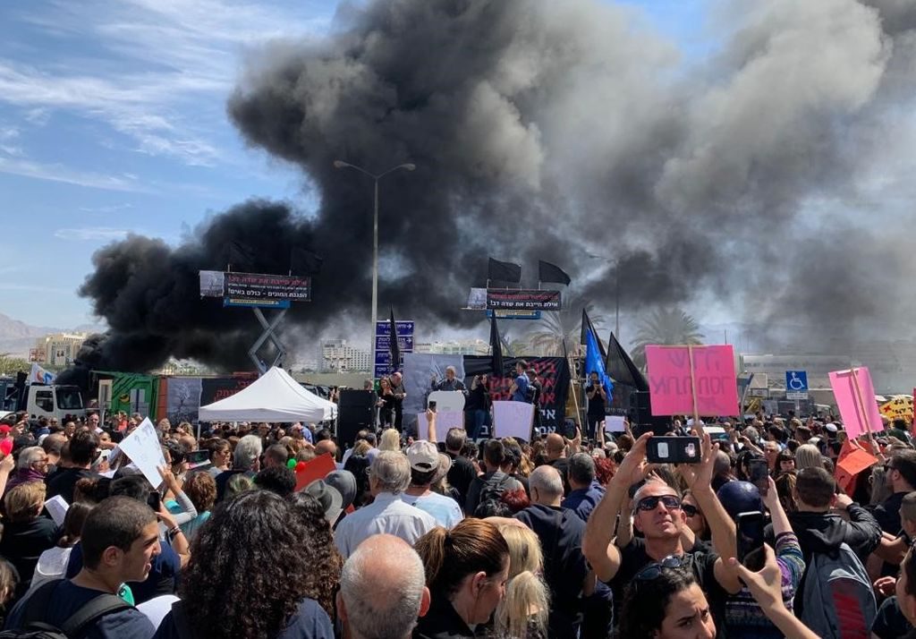 אלפים מתושבי אילת ביניהם חולים, סטודנטים, תלמידים ובני נוער, עובדי מלונות ותעשיית התיירות, עובדי רשות שדות התעופה וחברות התעופה, עובדי העירייה ושלוחותיה, עובדי בית החולים "יוספטל", מרכזי הקניות, חברות, ארגונים וועדי עובדים, הפגינו היום (ג׳) באילת כנגד סגירת שדה דב. הלימודים הושבתו מהשעה 11:00 בבוקר, בגיבוי פורום ההורים העירוני ובניגוד להוראת משרד החינוך. עשרות משאיות, כלים כבדים ומוניות סגרו את הכניסות לעיר בכביש 90 וכביש 12 ועשן שחור וסמיך היתמר על רקע שריפת צמיגים.