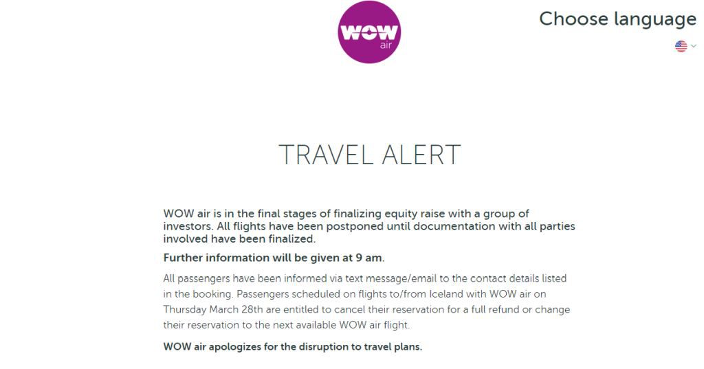 חברת וואו אייר (WOW air) הודיעה בהודעת התראה באתר האינטרנט שלה, כי היא השעתה באופן זמני את פעילותה האווירית בשעה שהיא "בשלבים הסופיים של השלמת גיוס הון עם קבוצת משקיעים". חברת הלואו קוסט האיסלנדית מציינת כי הטיסות כרגע לא בוטלו אלא נדחו.