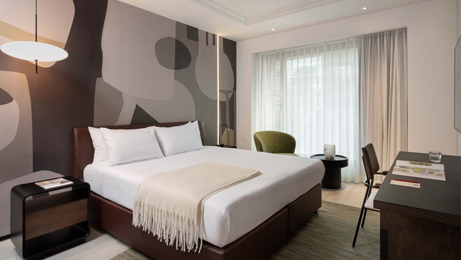 חדרי האירוח עוצבו בגוונים של ירוק, אפור ועץ בהיר, בהשראת צורות אורגניות מן הטבע. תאורה נסתרת, רצפת עץ בהירה וריהוט בקווים נקיים יוצרים תחושה אוורירית ומדויקת, בעוד גב מיטה מעור ומצעים לבנים מוסיפים נגיעה של יוקרה קלאסית. כל חדר מצויד בטכנולוגיה מתקדמת ומציע נוף פתוח של תל אביב ורמת גן.