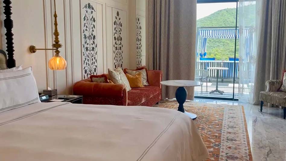 ביקורנו באודייפור היה גם הזדמנות זהב ללון כנסיכים בארמון חדיש ומודרני בהשפעה מקומית ארכיטקטונית. מדובר ב – Fairmont Udaipur Palace, מלון יוקרה שנפתח בקיץ האחרון, שבו מורשת ויוקרה מתמזגות בין ההרים מעל העיר הלבנה. עטופים ביצירות אמנות של נמרים המסמלים את חיות הבר שעדיין משוטטות באזור התקבלנו בטקס קבלת פנים מלכותי: הובלנו אל מתחת לחופה מרשימה, כשמטר עלי כותרת של ורדים וציפורני חתול צונח עלינו מן השמיים כשריחם מתערבל באוויר. כך נפתחה חוויתנו כאן ברזורט הבלתי נתפס הזה על צלע ההר עם נוף עוצר נשימה.