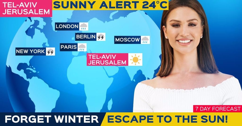 "תל אביב וירושלים מוצפות שמש בביקור אחד בהחל מ-130 פאונד". מקור משרד התיירות