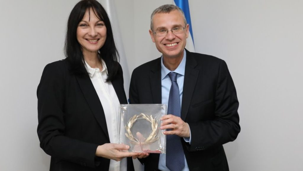 שר התיירות יריב לוין עם שרת התיירות לשעבר אלנה קונטורה ביריד התיירות IMTM 2019. צילום חן גלילי