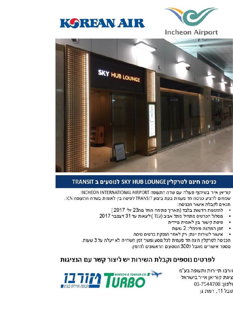 קוריאן אייר בשיתוף פעולה עם שדה התעופה של סיאול שמחים להציע כניסה חד פעמית לטרקלין במצב של טרנזיט